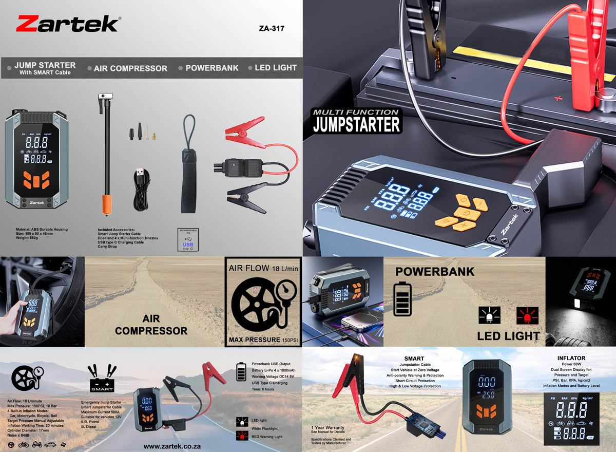 Zartek ZA-317 ZA317 Rechargeable Jump Starter Air compressor portable inflator Pump