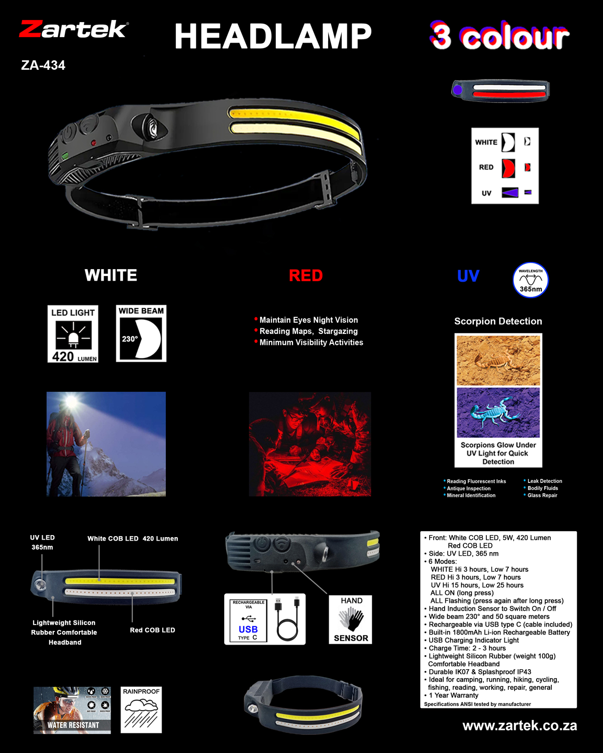 ZA-434 LED Headlamp USB Rechargeable, 3 Colour