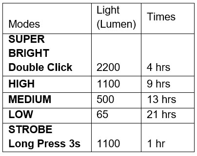 • Modes: Super Bright (double click) – High – Medium – Low – Strobe